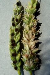 発生記録のほとんどなかった本病が、平成25 年には3 振興局内の複数地域で確認され、中には激発事例も含まれた。本病の罹病株は稈長がやや短くなるが、軽微な場合は識別が困難である。暗緑色を帯びる病穂(写真右)の内部は茶褐色の粉状物(厚膜胞子、写真左:切開して内部を露出)が充満するが、外皮は破れにくく、裸黒穂病のような胞子の露出、飛散はない。病穂は生臭い悪臭を放ち、発生すると減収のみならず異臭による品質低下を招く。さらに、汚染された生産物が乾燥調製施設に混入すると、施設全体の生産物が汚染されるため被害は大きくなる。発生ほ場産の汚染種子は翌年の発病につながるので、本病対策として、健全種子の生産と使用は最も重要である。
