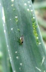 平成25 年、石狩、空知、上川、オホーツク地方にかけてねぎ、たまねぎでネギハモグリバエの被害が多発した。本種はねぎ類やにらなどネギ属のみを餌とし、葉の内側から不規則な線状の食痕を残す。多発ほ場のたまねぎでは、りん茎まで広がった幼虫加害による出荷物の品質低下が問題となる事例もあった。同年の発生状況から、道内では例年になく越冬密度が高いと思われる。そのため、当面はねぎ類において本種発生および被害に対する注意が必要である。成虫は葉に縦に数個並んだ白い点状の食痕(次ページ写真)を残すので、これが早期発見の手がかりとなる。