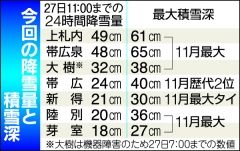 日本海中部の低気圧が通過する影響で、十勝地方は26日午後から27日にかけて大雪に見舞われた。帯広測候所によると、26日の降り始めから27日午前11時までの降雪量は中札内村上札内で49センチ、帯広泉48センチ、大樹(機器障害により27日午前7時まで)32センチだった。帯広は24センチ。また、積雪量は管内6地点で11月最大を記録。帯広は40センチで、40センチ以上は1947年11月27日以来68年ぶり。管内の南部を中心に停電や、道路の通行止めなども発生している。