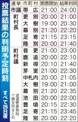 道選管事務局十勝支所(十勝総合振興局)によると、町村長選は午後11時15分、市議選は27日午前0時ごろまでに大勢が判明する見通し。
