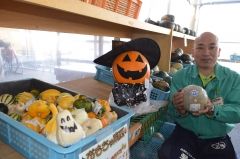 それでも、ハロウィーン用に飾るオレンジ色のカボチャの売れ行きは例年通りに推移。ピンポン球大のかわいらしい物から、重量約30キロの巨大カボチャまでを用意し、学校や温泉施設、個人などが購入している。人気はバスケットボール大で価格は600円前後。