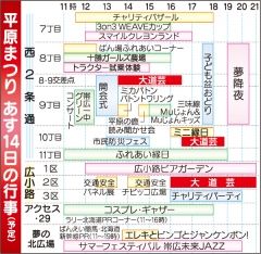 14日に本格的スタートとなるおびひろ平原まつりは、西2南7~11の西2条通や広小路など、帯広のまちなかを舞台に同日午前11時から午後9時ごろにかけ、縁日やビアガーデン、音楽イベント、大道芸など、さまざまな催しが行われる。
