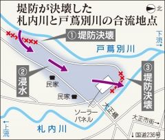 台風10号の大雨で両河川の上流部は総雨量が500ミリに達した。札内川では8月31日早朝、大正橋下流の左岸が約200メートルにわたり決壊が確認された=図の地点(3)。戸蔦別川も合流地点の1キロ余り上流の右岸が約300メートル決壊、流れが変わっていた=同(1)。合流地点の外側にある民家が床上浸水し、約30ヘクタールの畑は農作物や耕土が流失=同(2)。帯広市内の大きな被災地の1つで、管内を訪れた閣僚らも相次いで視察した。