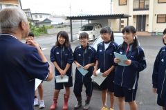 女子生徒は各戸を回り、町災害ボランティアセンターに関するチラシやメッセージカードを配布。「困っていることはありませんか」とニーズ調査にも取り組んだ。54歳の主婦は「水が出ないので洗濯が大変」とこぼした。10月から生徒会長を務める岡谷内莉子さん(2年)は「家を流された生徒もいる。私たちができることを少しでもやりたい」と話していた。
