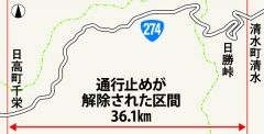 昨年夏の台風災害を受け、清水町清水-日高管内日高町千栄まで延長36・1キロで通行止めが続いていた国道274号日勝峠の通行が28日午後1時、約1年2カ月ぶりに再開された。日勝峠が全線対面通行で再開したことにより、昨年8月に道内に上陸、接近した台風で被害を受けた国道は全て通行止めが解除された。