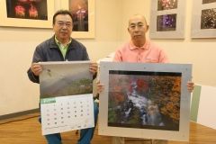 掲載されたカレンダーを持つ松崎さん(左)と入賞作品を手にする村田さん