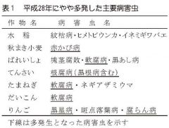 平成28年は、夏季が多雨となったことから軟腐病など腐敗症状となる病害が多発した。また、秋まき小麦のなまぐさ黒穂病が道内の広域にわたって発生し大きな問題となった。一方、てんさいの西部萎黄病、たまねぎのネギハモグリバエの発生量は前年に比べ少なくなった。 主要病害虫のうち多発となったものは、秋 まき小麦の赤かび病、ばれいしょの軟腐病、 てんさいの根腐病(黒根病を含む)、たまねぎの軟腐病、だいこんの軟腐病、りんごの黒星病、腐らん病、やや多発となったものは、水稲の紋枯病、ヒメトビウンカ、イネミギワバエ、バレイショの塊茎腐敗、黒あし病、たまねぎのネギアザミウマ、りんごの斑点落葉病であった(表1)。
