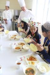 シェフが腕を振るったミネストローネやポテトグラタンなど5品に子どもたちは「おいしい!」と笑顔。食事が終わった後は料理人の仕事について加藤支部長らが話し、「料理人は食材をおいしく食べてもらう仕事。きょうも午前7時から準備した。料理ができるまでには時間がかかる」と伝えた。