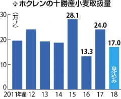 管内の小麦の9割以上を取り扱うホクレンによると、18年産の販売量は豊作だった前年を29.2%下回る17万トンとなる見通し。内訳は中力品種の「きたほなみ」が28.1%減の16万1000トン、超強力の「ゆめちから」が38.5%減の8000トンなど。