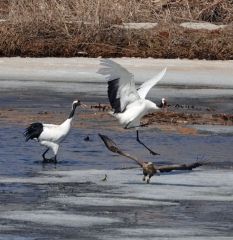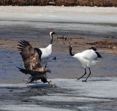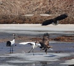 タンチョウがまだ水温の低い浅瀬で魚をつまみ上げて氷の上に置いたところ、奪おうとオジロワシが急接近した。タンチョウはくちばしを大きく開けて抗議するようにオジロワシに迫り、足蹴り。オジロワシは魚をつかんで逃げようとしたが、途中で落としてしまい、小競り合いが続いた。