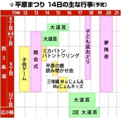 第71回おびひろ平原まつり初日の14日は、午前11時から午後9時にかけて、帯広市内の西2南7~11や広小路で、ステージイベントや大道芸が繰り広げられる。