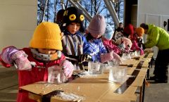 氷まつりの彫刻をより身近に感じてもらおうと、NPO法人日本氷彫刻会北海道地方本部帯広支部の馬淵善範支部長が、氷の削り取り方や氷彫刻の特徴について解説した。子どもたちは好みの形に削り取ってアイスキャンドルを完成させ、高さ約150センチ、厚さ25センチ、重さ135キロの氷彫刻にアイスキャンドルをはめこんだ。出来上がった氷彫刻に「大きい」や「きれい」と歓声を上げていた。
