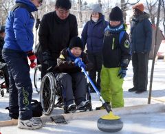 2日はカーリング体験コーナーで、NPO法人みんなのポラリス(水口迅代表理事)がパラリンピックの正式種目「チェアカーリング」の体験会を開き、多くの子どもらが参加した。