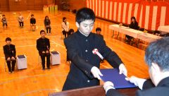 萩野校長から卒業生一人ずつに手渡された卒業証書。しっかりと両手で受け取った(22日午前10時5分ごろ、帯広清川小学校で。長尾悦郎撮影)