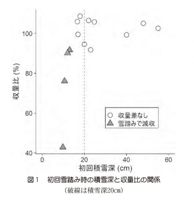 秋まき小麦の上での雪踏みをすると、無処理(自然積雪)と比べて子実重は増加しないか、減収する場合もありました。減収した圃場では積雪深が浅いときに雪踏みを行っていたため、茎葉が損傷し、減収する要因となっていました(図1)。したがって、秋まき小麦圃場では積雪深20cm 未満での雪踏みを避けることで、効果的な野良イモ対策を実施することが可能です。