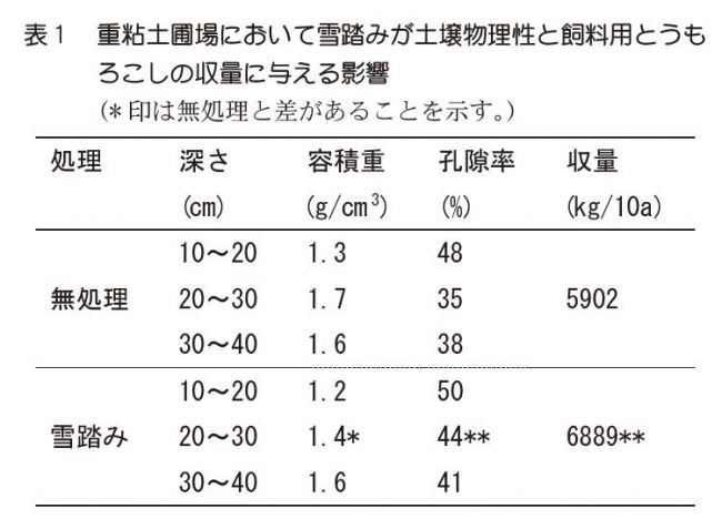 重粘土圃場での雪踏みは砕土性が向上し土壌が膨軟化します。深さ20~30cm まで土壌が膨軟化することで、その後の飼料用とうもろこしの増収が期待できます(表1)。