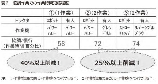 (2 )有人トラクタとの協調作業により、1作業協調で慣行から約40%、2作業協調では約25%の作業時間を削減可能です。
