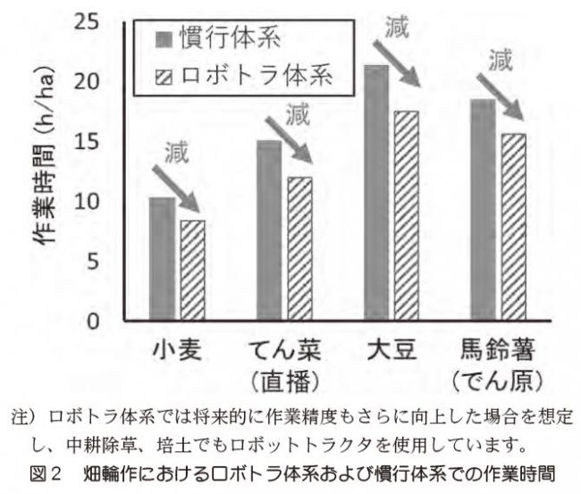 (3 )整地、播種、中耕除草、馬鈴薯培土、てん菜茎葉処理、小麦残渣処理でロボットトラクタを使用した場合、作業時間が約17~23%削減されます。