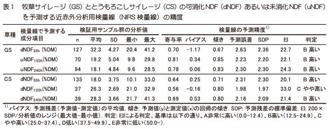 (1)GS の培養30時間後の可消化NDF(dNDF30h)、培養120および240時間後の未消化NDF(uNDF120h、uNDF240h)、CS のdNDF30h、培養120および240時間後の可消化NDF(dNDF120h、dNDF240h)を予測するNIRS 検量線を作成し、精度判定は、「C やや高い」~「B 高い」であった(表1)。