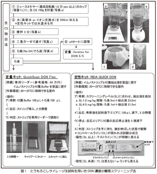 定量キット(QuickScan DON Flex,ENVIROLOGIX 社)および定性キット(RIDA QUICK DON,R-Biopharm 社)を用いた、生CS 中DON 検査のプロトコルを作成する。