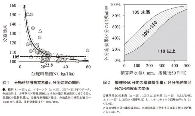 (1)分施効果は、根釧およびオホーツクのいずれの地域においても、分施時の土壌無機態窒素量(株間、0~40cm)が少ないほど大きく、同窒素が約23kg/10a以下で105(分施による増収率5%)以上になる可能性が高いと見込まれた(図1)。また、生育初期の積算降水量が250mm を超えると同窒素は23kg/10aを下回る可能性が高いと考えられた(データ略)。