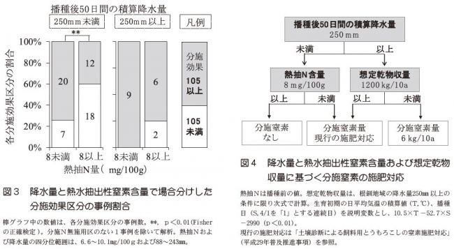 (3)生育初期の降水量が250mm 未満かつ熱抽N 量(mg/100g)が8以上の条件では、分施効果105未満(分施の効果が極めて小さい)の事例割合は、同N 量8未満の条件より統計的に高かった(図3)。また、降水量250mm 以上かつ乾物収量1200kg/10a未満の条件(すべて根釧地域)では、分施窒素量6kg/10aまでは増収を期待できた(データ略)。これら事例と現行施肥対応を踏まえ、降水量、熱抽N、想定乾物収量で仕切った分施窒素の施肥対応を策定した(図4)。