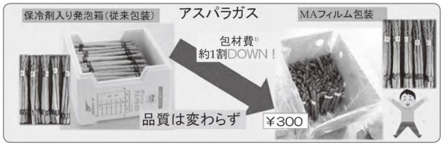 (1)アスパラガスでは、MAフィルムの使用で、保冷剤入り発泡箱(従来)より包材費がダウンできます。