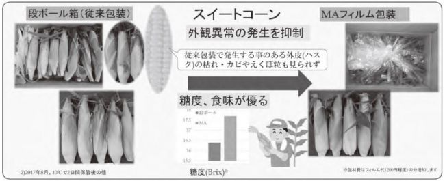 (2)スイートコーンでは、MAフィルムの使用で、段ボール箱包装(従来)より品質がアップします。