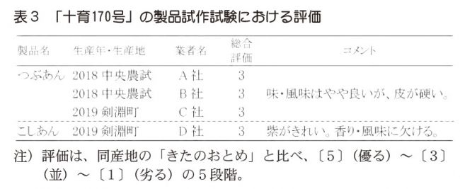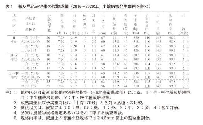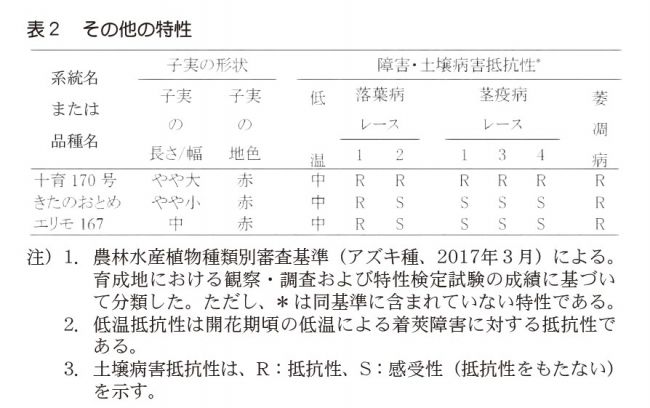 「十育170号」は、対照品種「きたのおとめ」及び「エリモ167」と比べて、成熟期は同等で、倒伏程度は両品種より小さい。子実重は両品種と同等からやや優り、百粒重、外観品質は両対照品種とおおむね同等である。落葉病(レース1,2)、茎疫病(レース1,3,4)、萎凋病に抵抗性を持ち、低温抵抗性は“中”である。子実の長さ/ 幅は、「きたのおとめ」の“やや小”、「エリモ167」の“中”に対し、“やや大”に分類される。子実の地色は両対照品種と同じ“赤”である。製あん・和菓子加工業者による製品試作試験における加工適性は「きたのおとめ」と同等である。
