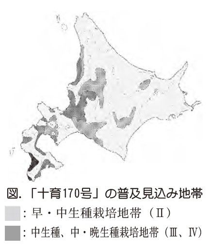 1)普及見込み地帯: 全道の小豆栽培地帯のうち、早・中生種栽培地帯(II)、中生種栽培地帯(III)、中・晩生種栽培地帯(IV)及びこれに準ずる地帯の茎疫病、落葉病の被害が発生する地域