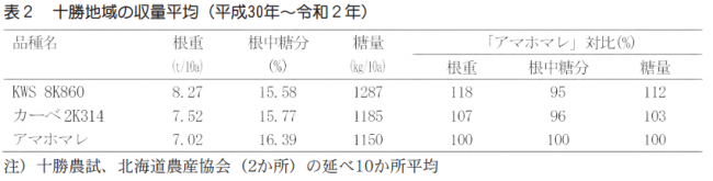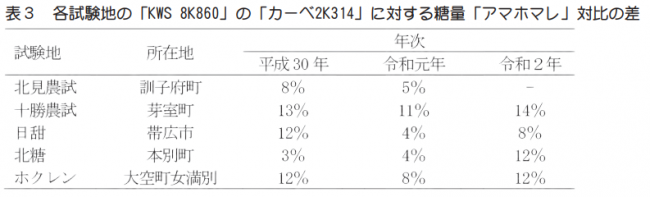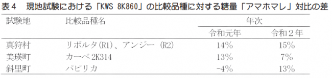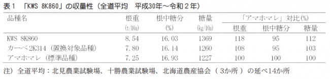 標準品種「アマホマレ」との対比で収量性を説明する。全道の平均では「KWS 8K860」は「カーベ2K314」より根重が10%多く、根中糖分がほぼ並で、糖量が9%多い(表1)。十勝地域の平均でも同様の傾向であった(表2)。表3に、3か年の各試験地での「カーベ2K314」との糖量「アマホマレ」比の差を示す。全ての試験か所で「カーベ2K314」より糖量が多く、その差は3%から14%であった。表4に、現地試験3か所における糖量「アマホマレ」比の比較品種との差を示す。「カーベ2K314」を供試した美瑛町では、表1と同様に約10%糖量が多く、その他の試験地でも、令和元年の斜里町を除いて約10%糖量が多かった。以上のように、「KWS 8K860」は安定して多収性を示した。
