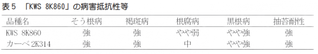 そう根病抵抗性、褐斑病抵抗性は“強”、黒根病抵抗性は“やや強”でいずれも「カーベ2K314」と同様である。根腐病抵抗性は「カーベ2K314」の“中”に対して“やや弱”で1ランク劣る。以上のように、耐病性は根腐病抵抗性を除いて「カーベ2K314」並である。抽苔耐性は、「カーベ2K314」と同様の“強”である。(表4)