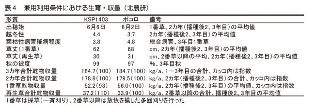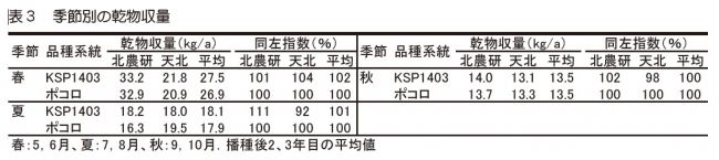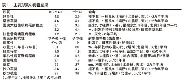 「KSP1403」は、雪印種苗株式会社北海道研究農場と酪農試が、6栄養系の交配による合成品種法により育成した新品種である。平成27年~29年に、雪印種苗株式会社北海道研究農場(長沼町)ならびに道東の試験圃(芽室町、別海町)において、場外予備検定試験を実施し、越冬性と収量性に優れたことから、平成30年~令和2年に、道内5場所(北農研センター、酪農試天北支場、畜試、酪農試、北見農試)において品種比較試験を実施した。その結果、特に道北、道央の多雪地帯において、標準品種「ポコロ」と比較して、収量性は同程度であるが、越冬性に優れることが明らかになった。