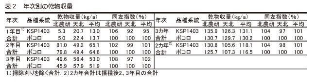 4)永続性:2年目収量に対する3年目収量の指数は同程度である(表1)。秋の被度は同程度である。雑草の侵入はやや少ない傾向にある。