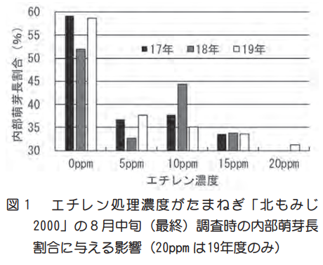 1)庫内エチレン5~20ppm の処理により「北もみじ2000」において翌8月(最終)調査時の内部萌芽の伸長が抑制された(図1)。いずれの濃度でも内部萌芽長割合30% を越えたが、5ppm 以上であれば一定の効果が見られたものの5、10ppm では年次により効果が劣る場合があった。一方、15ppm では年次変動が少なく安定した効果が見られたことから、本試験ではエチレン濃度は15ppm を推奨する。