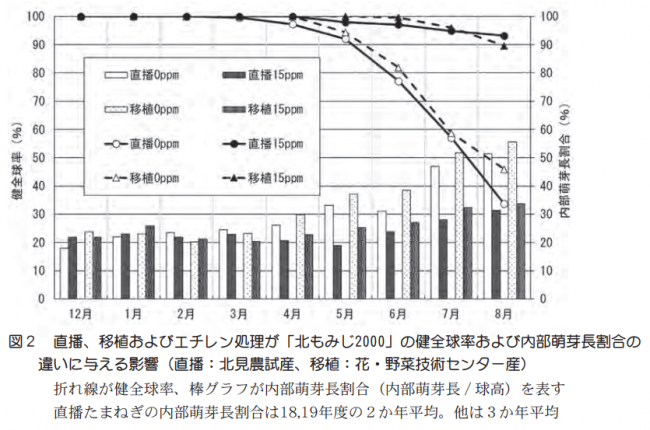 2)庫内エチレン15ppm の処理により、直播、移植ともに「北もみじ2000」の健全球率の低下および内部萌芽長割合の増加は遅延した(図2)。その傾向は直播か移植かにかかわらず同様の効果が認められ、エチレン処理方法は直播か移植かによる変更の必要はないと判断した。