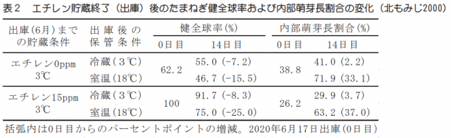 試験項目等:貯蔵終了後(出庫)から14日間、低温および室温で保管し健全球率 、 内部萌芽長割合を調査。供試品種;「北もみじ2000」