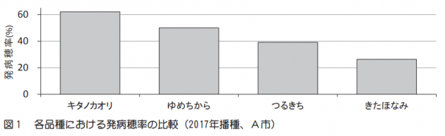 道内で栽培されている品種はすべて発生するが、発病程度には品種間差が認められ、主要4品種では「キタノカオリ」>「ゆめちから」>「つるきち」>「きたほなみ」の順で発病しやすい(図1)。