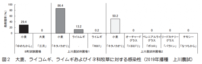 道内で発生しているなまぐさ黒穂病菌を接種したところ大麦は発病しなかった。一方、ライムギおよびライコムギは発病するが、ライムギの発病穂率は極めて低い。また、北海道の主要な牧草(オーチャードグラス、ペレニアルライグラス、リードカナリーグラス、チモシー)は発病しなかった(図2)。