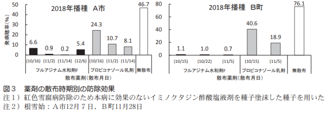 種子塗沫剤であるイプコナゾール・イミノクタジン酢酸塩水和剤Fは一定の防除効果(防除価20~69)が認められた(データ略)。プロピコナゾール乳剤は一定の効果が認められ、11月上~中旬の散布で効果が高かった。一方、フルアジナム水和剤Fは散布適期の幅が長く、10月下旬~11月中旬の散布で高い防除効果が認められた。なお、播種後から10月中旬および根雪直前の散布では防除効果が劣る事例が認められた(図3)。