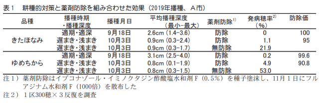イプコナゾール・イミノクタジン酢酸塩水和剤Fによる種子塗沫と適期・適深播種にフルアジナム水和剤Fの茎葉散布を組み合わせることで本病に対し高い防除効果が得られる(表1)。
