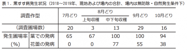 1)7月どり~10月どり作型を対象に本病の発生状況を調査した結果、7月どりおよび8月上旬に収穫する作型では花蕾での被害が認められず、本病に対する防除は不要と考えられた。これに対し、8月中旬以降に収穫する作型では花蕾での被害が認められ、防除対策が必要であった(表1)。