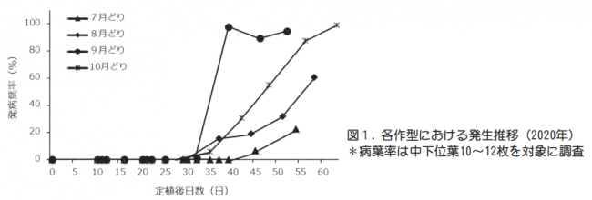 2)8月中旬以降に収穫する作型では概ね定植1ヶ月後頃(葉数12枚前後)に下位葉に初発が認められ、それ以降の生育後半の1ヶ月で急激に病勢が進展した(図1)。