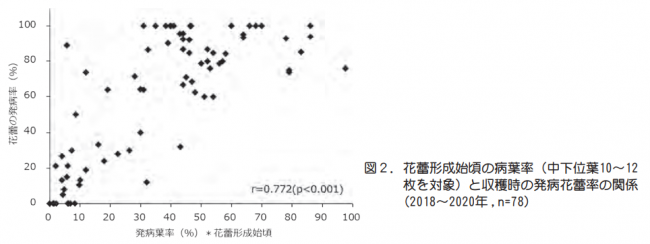 5)花蕾形成始頃(花蕾形成始期~形成揃期)の中下位葉での発病程度が高いと収穫時の花蕾の発病が多い傾向にあり(図2)、花蕾形成始頃までの葉の発生量抑制が花蕾被害軽減につながると考えられた。