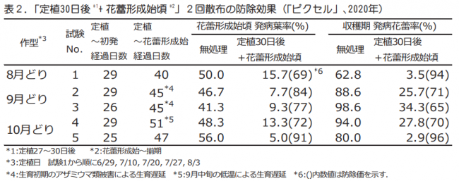 8)8月中旬以降に収穫する作型では、「定植30日後と花蕾形成始頃」の2回散布は、甚発生条件下であっても防除価概ね70以上の効果が得られ(表2)、可販化率(=100-発病花蕾率)も概ね7割以上であった。気象や虫害等で生育が停滞し花蕾形成始期が遅れ、結果的に収穫が遅れると、防除効果はやや低くなる傾向にあった。