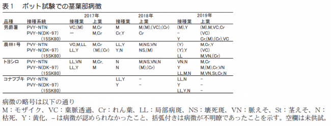 1)ポット試験における PVY-NTN の茎葉における病徴調査