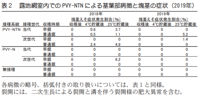 2)露地網室圃場試験における PVY-NTN の茎葉部病徴を表2に示した。2018年試験の接種当代では「男爵薯」で病徴が不明瞭、「アーリースターチ」では無病徴となったが、接種次世代の病徴は明瞭であった(データ省略)ことから、種いも生産現場での抜き取りは可能であると考えられた。ただし、年次や接種世代により病徴が不明瞭となる場合があることから、抜き取りは感染世代を問わず丁寧に実施する必要がある。