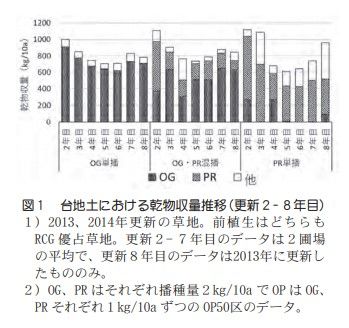 1)台地土では更新4年目以降はいずれの播種割合でも概ね OG60~70%、PR20~30%で安定して推移し(データ省略)、収量は OG 単播、PR 単播よりも高かった(図1)。播種割合の効果は更新3年目以降は判然としなかったが、雑草防除の点から考えると OG:PR =50:50の OP50が望ましい(データ省略)。