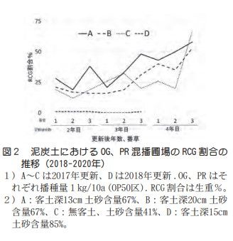 3)泥炭土における OG、PR の混播割合(OP50区)では1圃場を除き更新2年目は播種牧草割合が70% 以上で RCG 割合は20%程度だったが、3年目から播種牧草が衰退し、4年目には RCG 割合が40~50%となり、播種牧草割合が60% を下回った(図2)。草種構成の点から見て OG、PR 播種の効果は台地土よりも劣った。更新4年目においても RCG 割合を低く抑えた D 圃場では土砂含量が85%と高く、排水性が良好とみられ、なおかつ年間3回刈を行ったことが台地土での試験結果と同様の高い播種牧草割合を維持した要因と推測された(データ省略)。