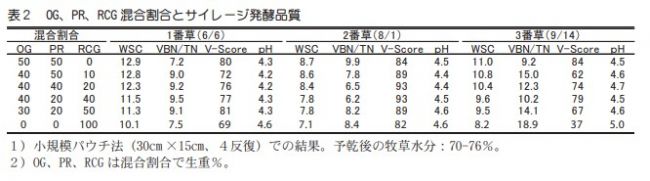 4)小規模パウチ法による試験では、OG、PR 混播割合が高くなることにより RCG 単独と比較して原料草のWSC 含量が高くなり、サイレージの発酵品質向上への寄与が期待できることが確認された(表2)。